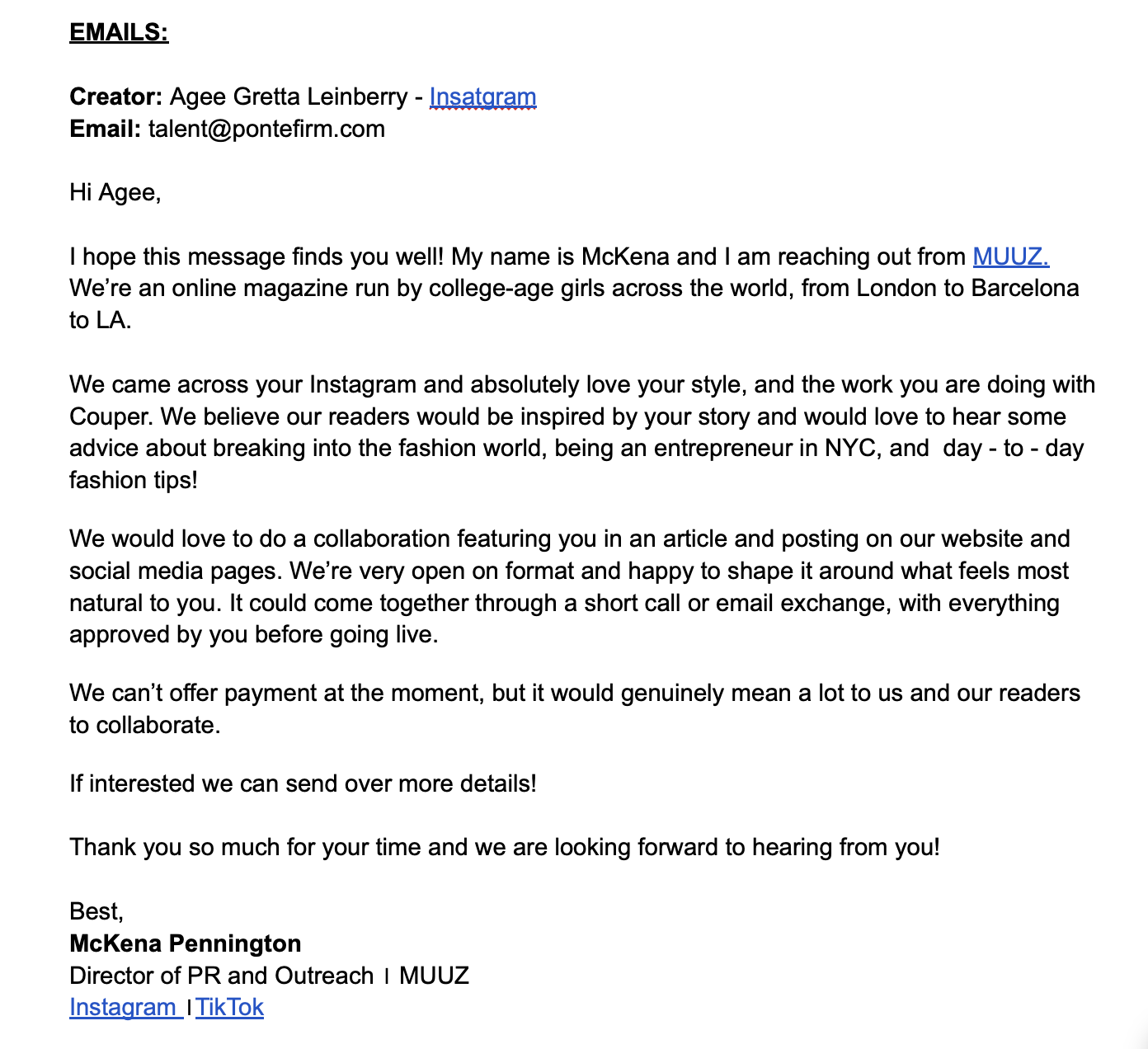 As the Head of PR and Outreach, I research and reach out to micro influencers that align with MUUZ values, the it girl energy, and relatability, young women need on social media. I set up interviews, or collaborations including spotlights, articles, and collaborative social media posts.